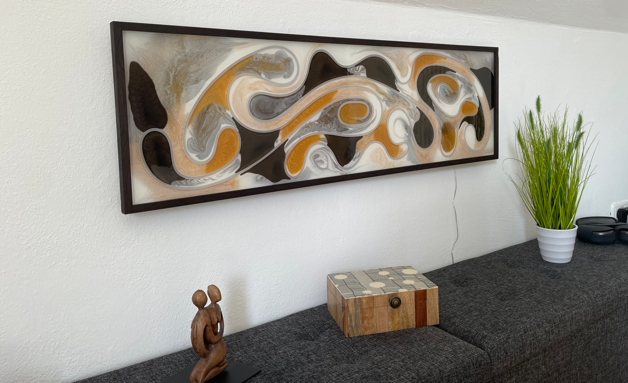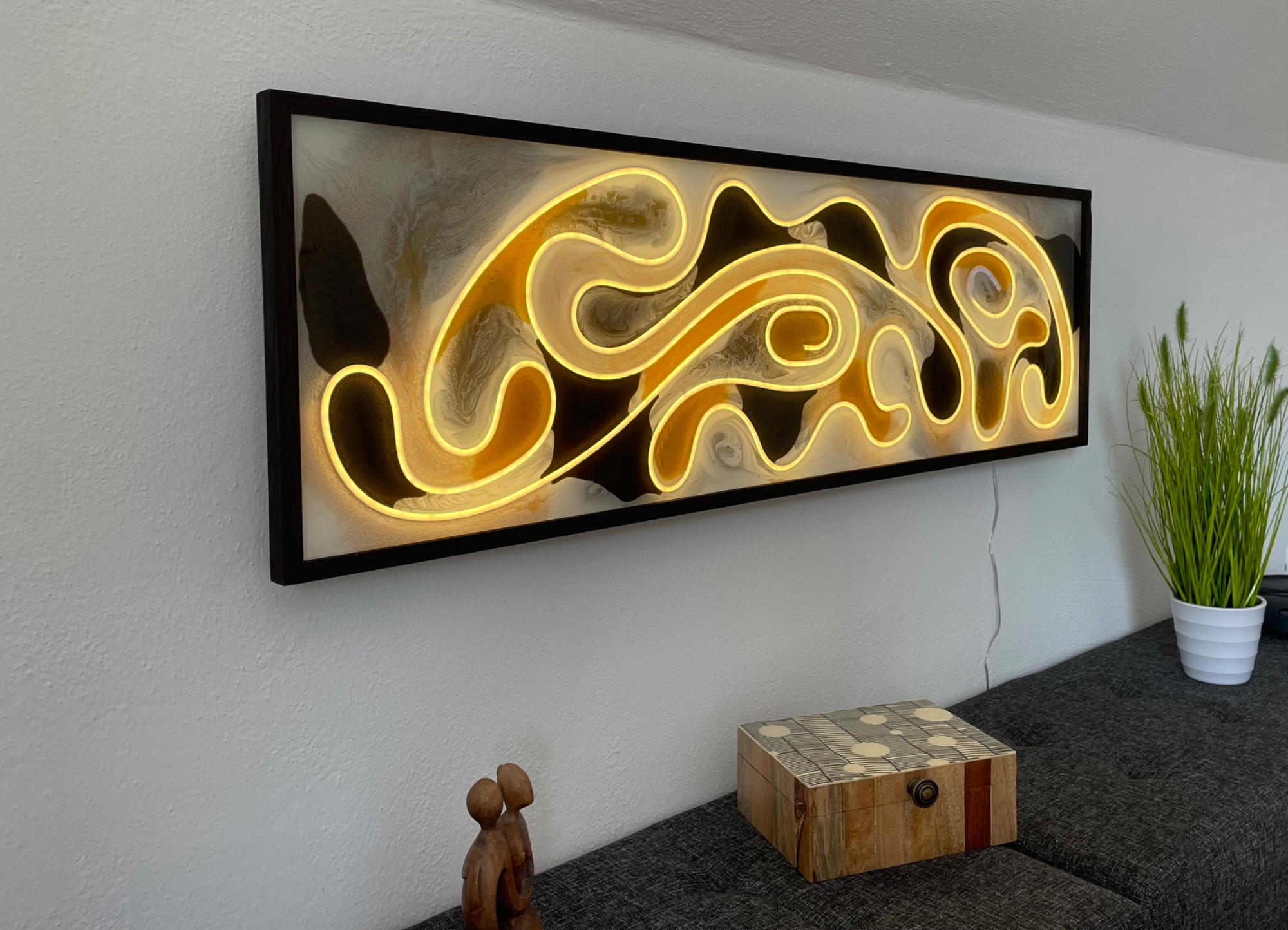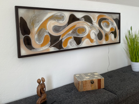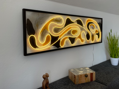 Das beleuchtete Wandpanel ist ein beeindruckendes Beispiel für exquisite Handwerkskunst in modernem Design. Der Rahmen aus hochwertiger Räuchereiche verleiht dem Kunstwerk eine warme, natürliche Ausstrahlung, während das integrierte LED-Stripe für stimmungsvolles Licht sorgen. Akzentuiert mit goldenen und bronzenen Elementen in Epoxid, strahlt das Panel Eleganz und Raffinesse aus und wird zum Blickfang in jedem Raum. Es ist nicht nur ein dekoratives Objekt, sondern auch ein Ausdruck von Kreativität und Kunstfertigkeit, das die Sinne anspricht und den Raum lebendig macht.