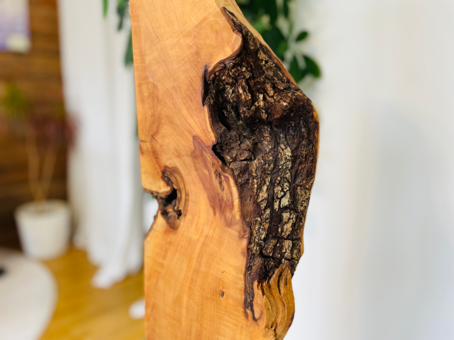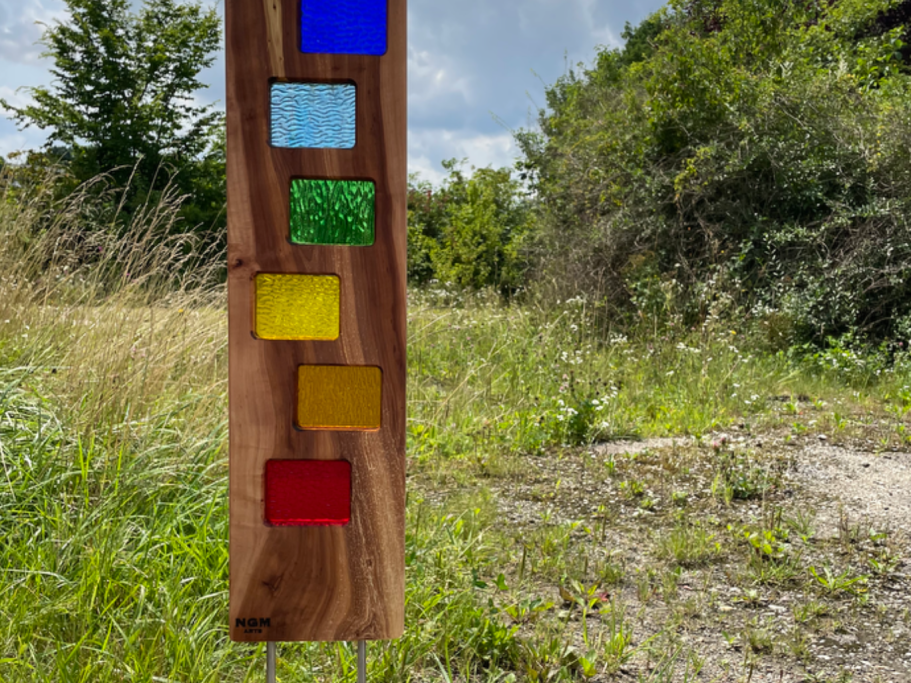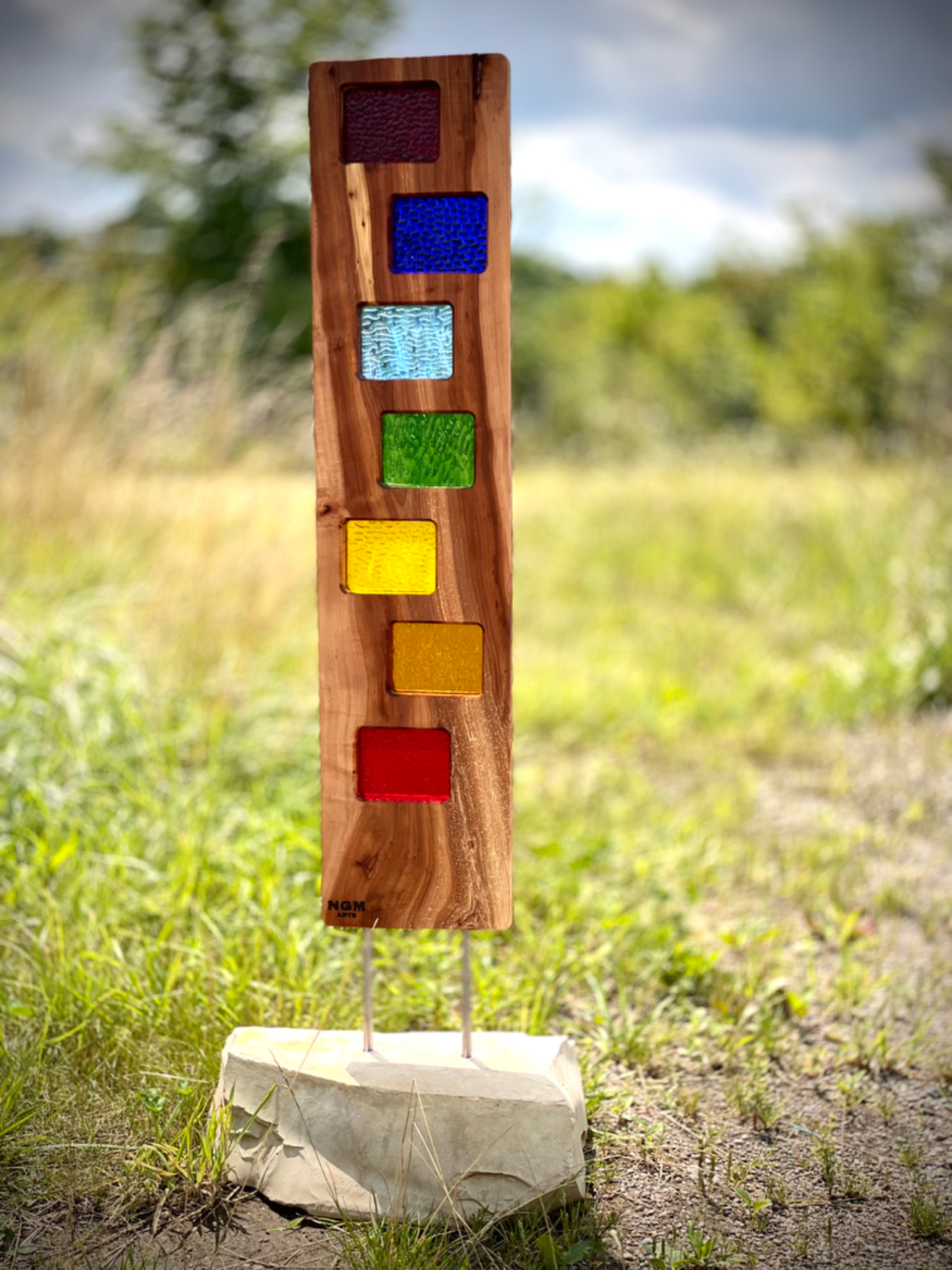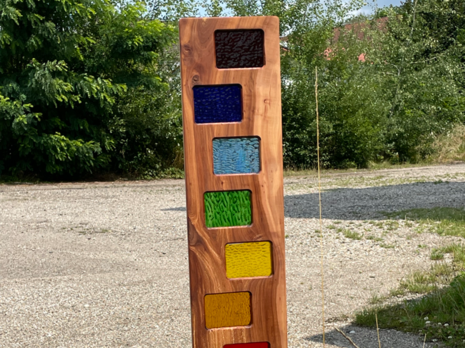 Die Chakrenskulptur aus Kirschbaumholz ist ein faszinierendes Beispiel für Holzkunst, die die Energiezentren des Körpers symbolisiert. Jedes Chakra wird durch filigrane Glaseinsätze hervorgehoben, die das Licht auf besondere Weise brechen und ein harmonisches Lichtspiel erzeugen. Diese kunstvolle Verbindung von natürlichem Material und spiritueller Bedeutung macht die Skulptur nicht nur zu einem ästhetischen Highlight, sondern auch zu einem meditativen Element, das zur inneren Balance und Energiearbeit einlädt.
