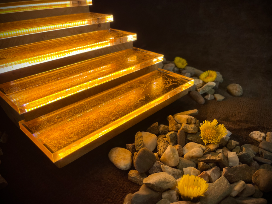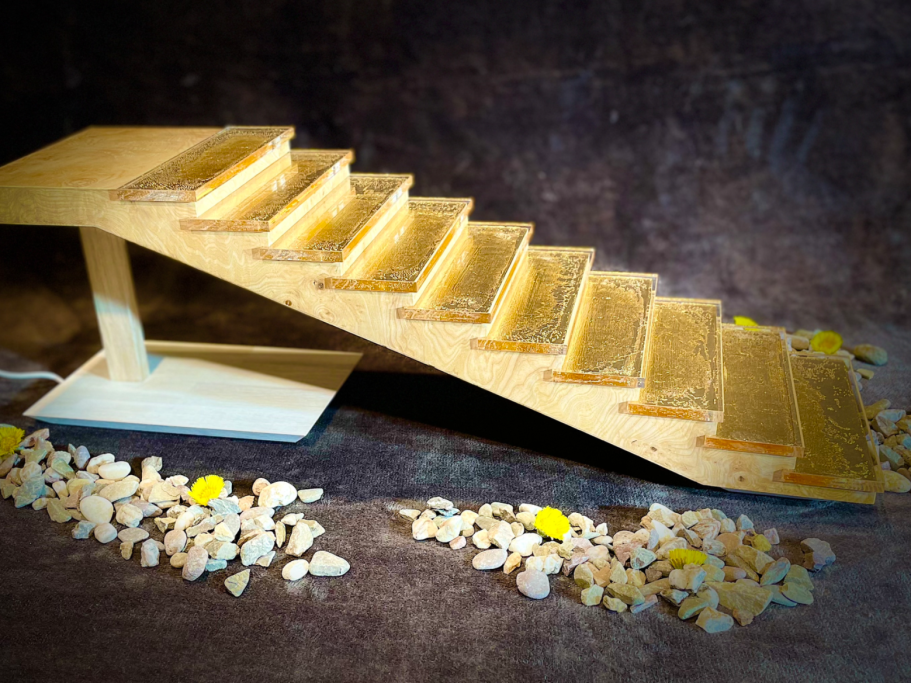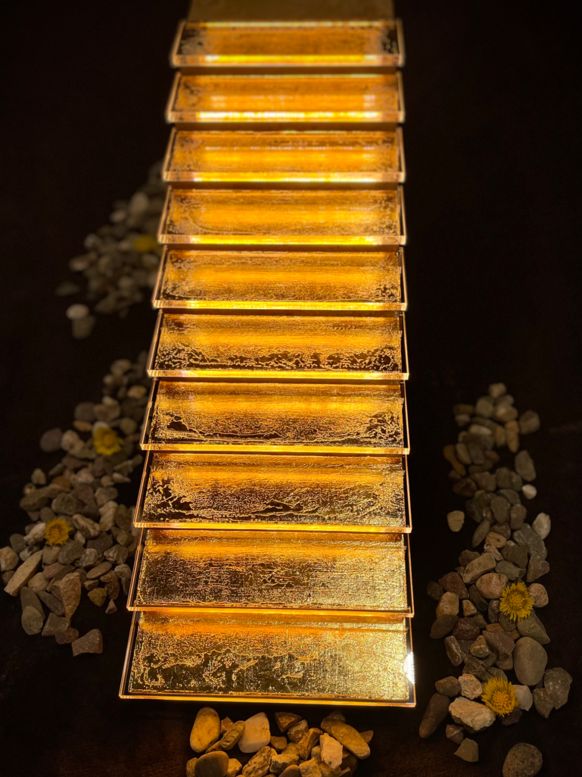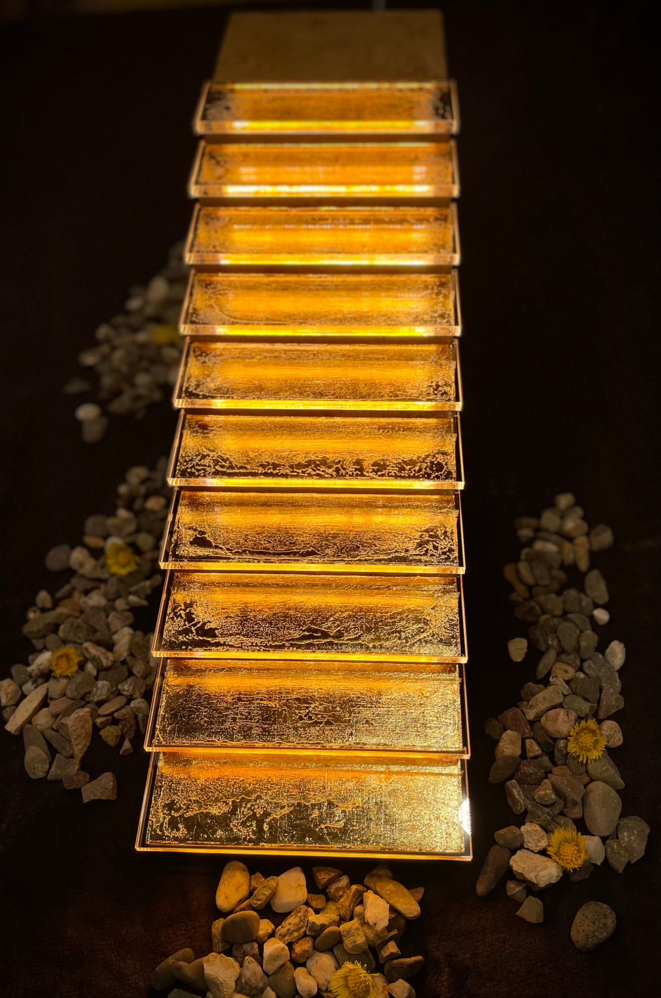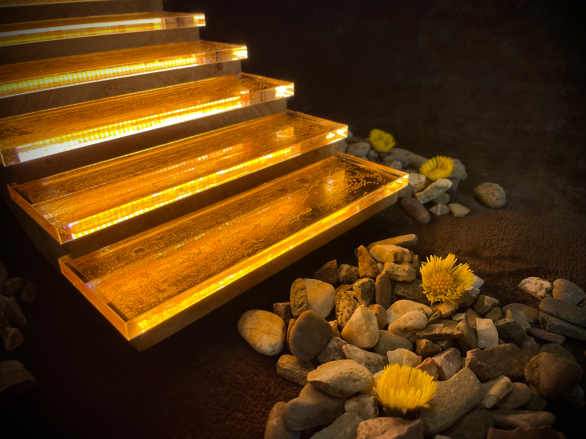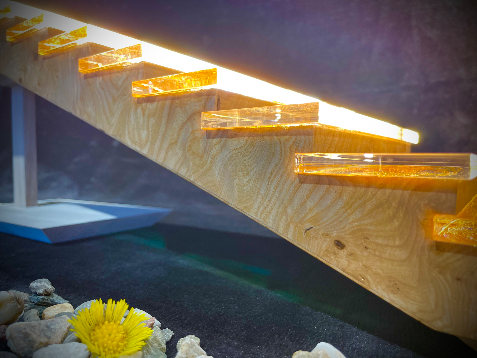 Die beleuchtete goldene Glastreppe ist ein atemberaubendes Beispiel für die gelungene Fusion von Holz und Technik. Mit insgesamt 10 Stufen und einer Gesamtlänge von 70 cm zieht sie sofort die Blicke auf sich. Jede Stufe ist kunstvoll mit Blattgold überzogen, was der Treppe einen luxuriösen Glanz verleiht. Das Grundgerüst ist mit hochwertigem Esche Furnier verkleidet. Diese eindrucksvolle Treppe verbindet elegantes Design mit fortschrittlicher Technik und schafft somit eine harmonische Verbindung zwischen traditioneller Handwerkskunst und modernem Stil.