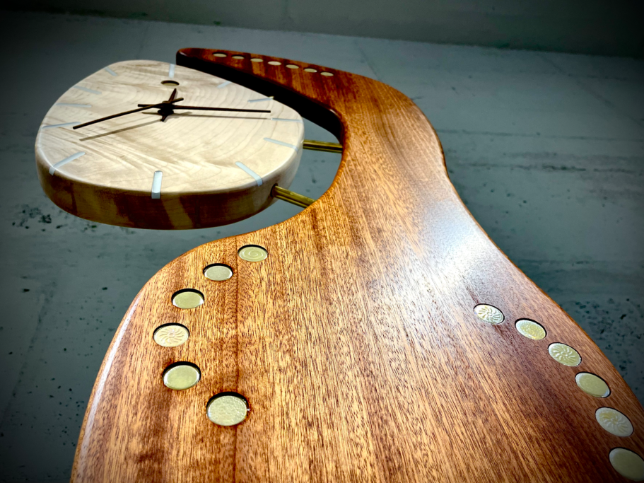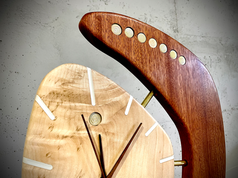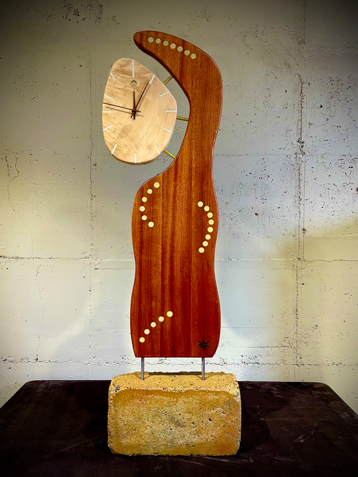 Die Uhrenskulptur ist ein faszinierendes Beispiel für hochwertige Holzkunst, die nicht nur funktional, sondern auch ästhetisch ansprechend ist. Mit einem massiven Sockel und einer Höhe von etwa 140 cm verkörpert sie Stabilität und Präsenz. Das an drei Messingstäben schwebende Zifferblatt, das kunstvoll aus Ahornholz gefertigt wurde, scheint förmlich zu schweben und zieht die Blicke auf sich. Die Holzzeiger und die Mosaikeinlagen ergänzen das Gesamtbild. Zusammen schaffen diese Elemente ein harmonisches Zusammenspiel von Form und Funktion, das die Tradition der Holzkunst auf moderne Weise interpretiert.
