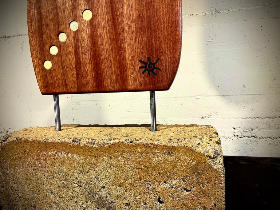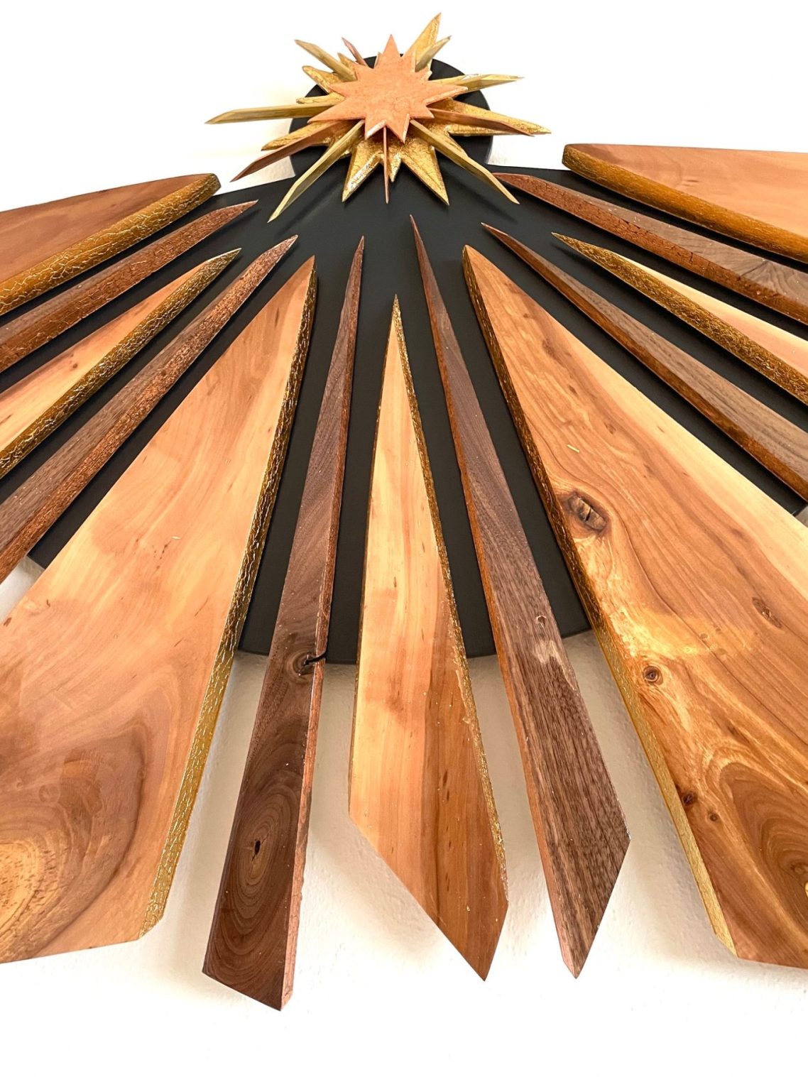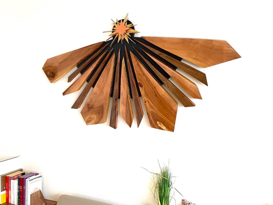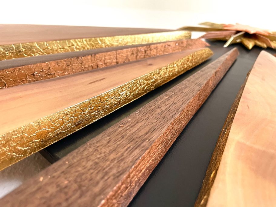Der Nordstern präsentiert eine exquisite Auswahl an Materialien und Techniken und hebt die Schönheit von Kirsch- und amerikanischem Walnussholz hervor. Die Kanten der einzelnen Objekte sind kunstvoll mit Blattgold und Blattkupfer veredelt, was ihnen einen luxuriösen Glanz verleiht und den Kontrast zwischen Holz und Metall betont. Kupfer- und Messingstäbe ergänzen die Komposition und verleihen dem Kunstwerk eine moderne Note, während sie gleichzeitig die natürliche Wärme des Holzes unterstreichen. So entsteht eine harmonische Verbindung zwischen traditioneller Handwerkskunst und zeitgenössischem Design.