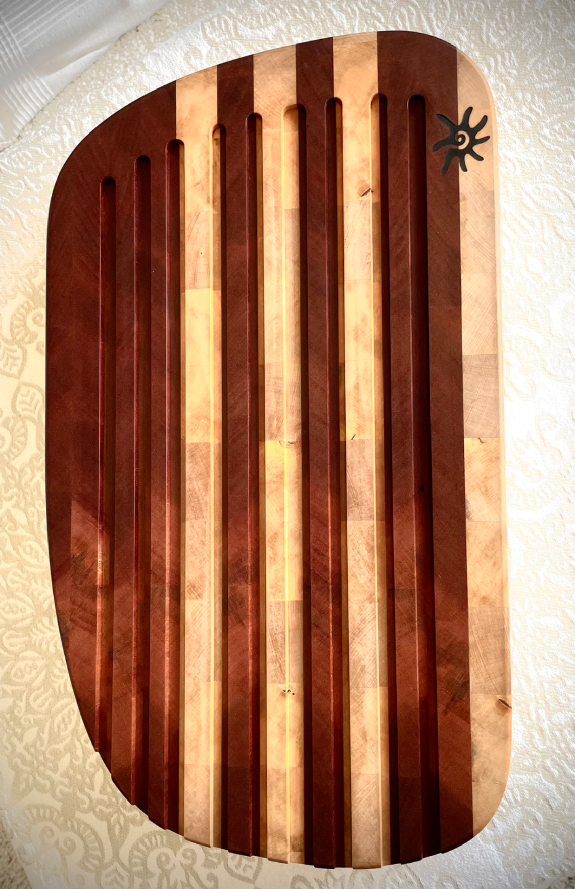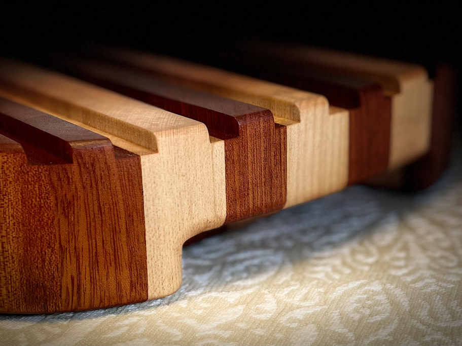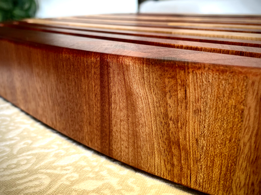Das Brotschneidebrett vereint die edlen Hölzer Ahorn und Mahagoni in einem einzigartigen Design. Mit einem Gewicht von 4,5 kg und den Maßen von 50 cm Länge, 29 cm Breite und 6 cm Höhe ist es nicht nur funktional, sondern auch ein ästhetisches Highlight in jeder Küche. Die Kombination aus dem hellen Ahorn und dem dunklen Mahagoni schafft eine harmonische Optik, die das Brett zu einem echten Blickfang macht. Dieses Brotschneidebrett bringt sowohl Stil als auch Qualität in Ihren Küchenalltag.